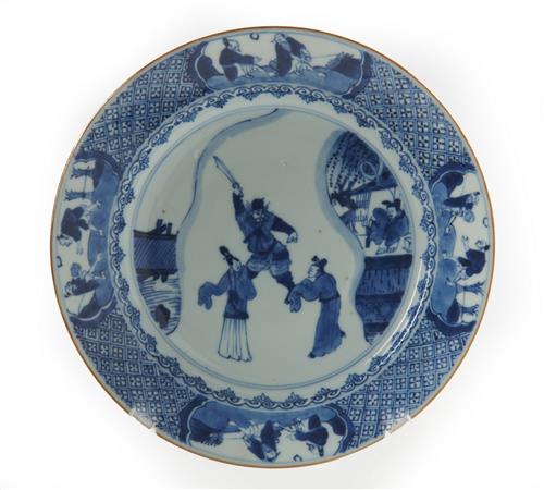 Decorated with a sleeping figure in a pavilion dreaming of three figures, surrounded by a diaper-pattern rim interspersed with shaped landscape reserves.