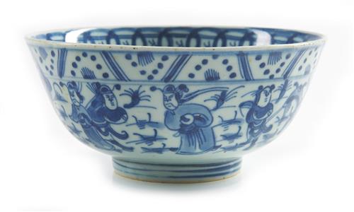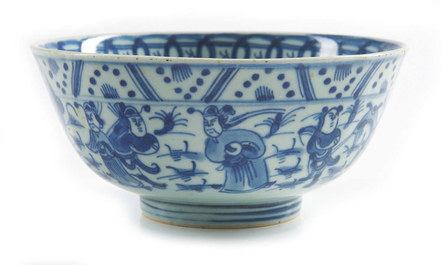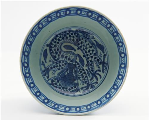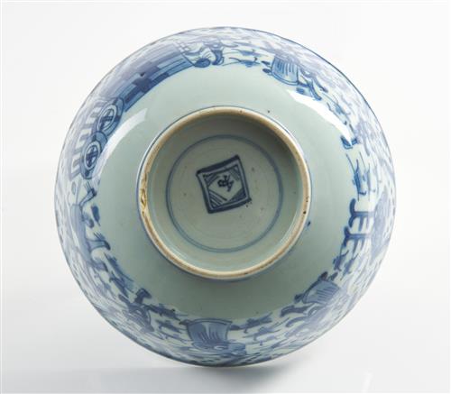Decorated to the exterior with figures in landscape and to the interior with a dragon roundel. Studio mark to the base.