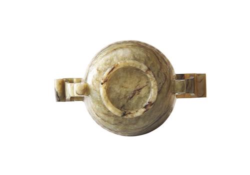 The jade of grey-green hue with black veins, relief carved with archaistic s-scrolls, with twin handles in the form of archaistic dragons.