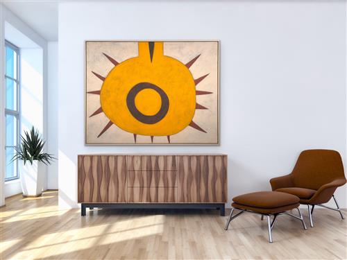 Very good condition overall, no major faults to report. Very minor foreign matter has settled on the edge, approx 1mm squared. Painting is housed in a light wood shadow box frame in good condition, with overall size 117 x 150 x 4.5cm