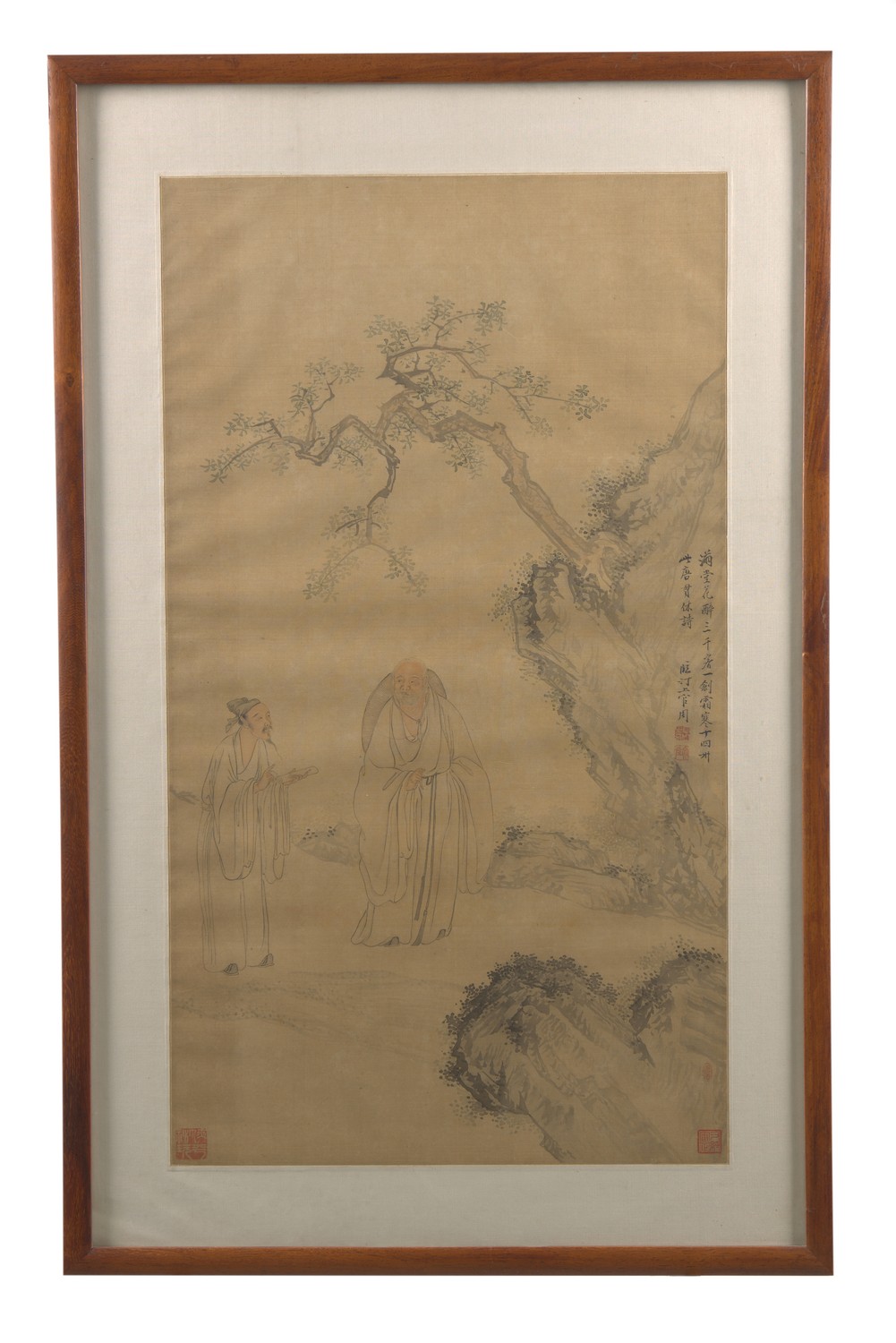 Depicting scholars in a landscape in ink and colours on silk, inscribed and with seals. Mounted in a silk border, framed and glazed.