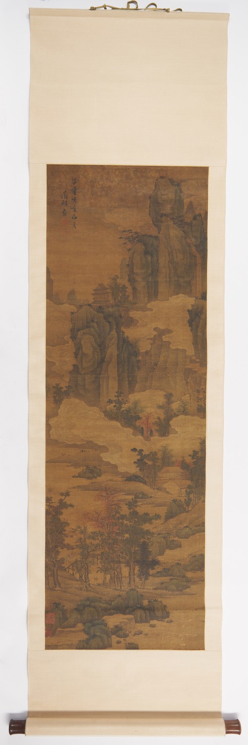 Ink on silk, depicting a mountainous landscape with pavilions, inscribed and with red artist and collector seals. Mounted as a scroll with plain silk border.