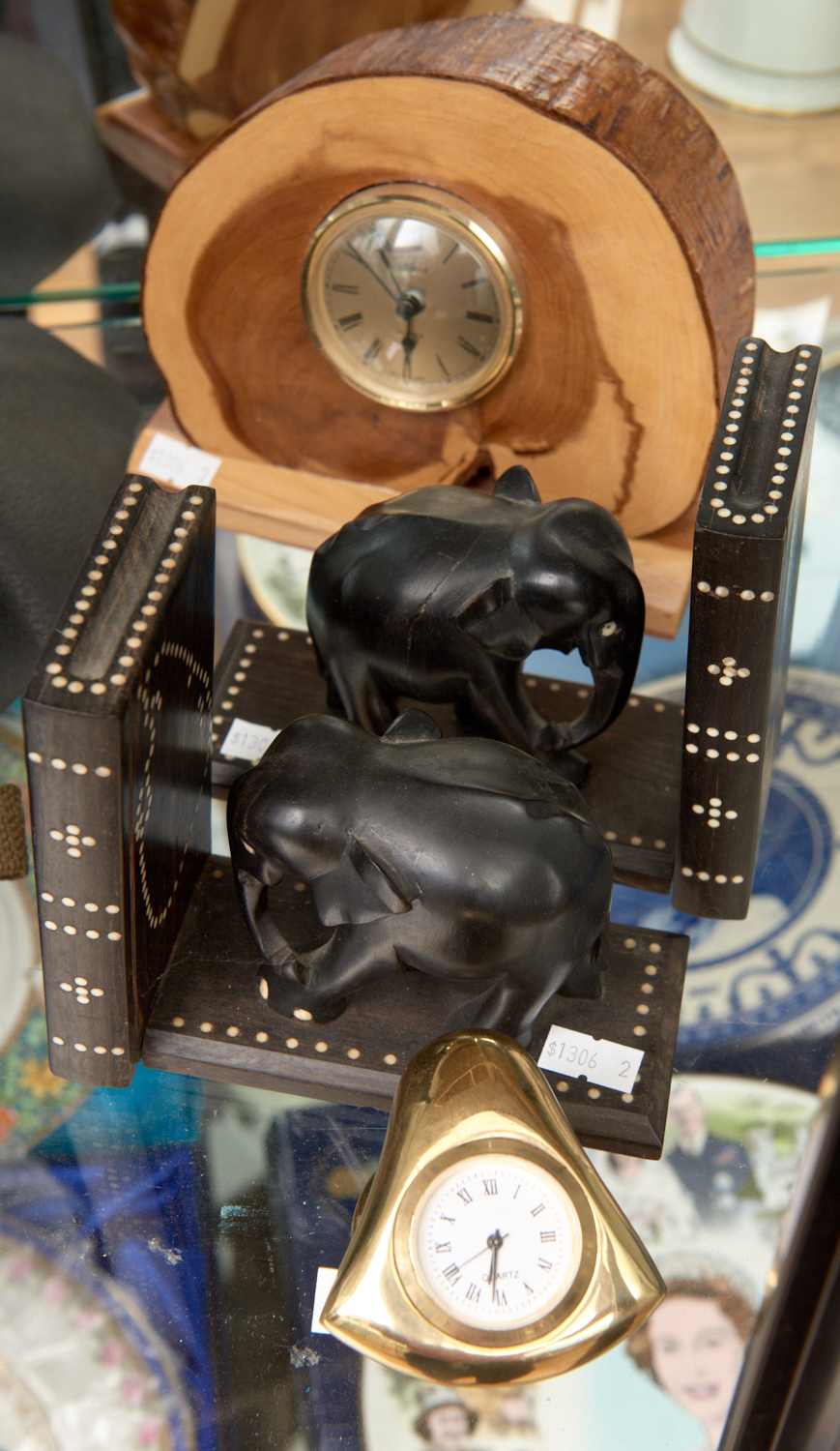 A PAIR OF BONE INLAID EBONY ELEPHANT BOOK ENDS AND TWO DESK CLOCKS