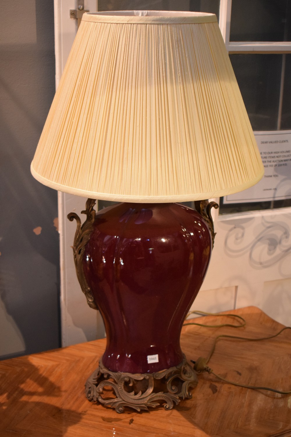A SUBSTANTIAL RED PORCELAIN AND BRASS TABLE LAMP