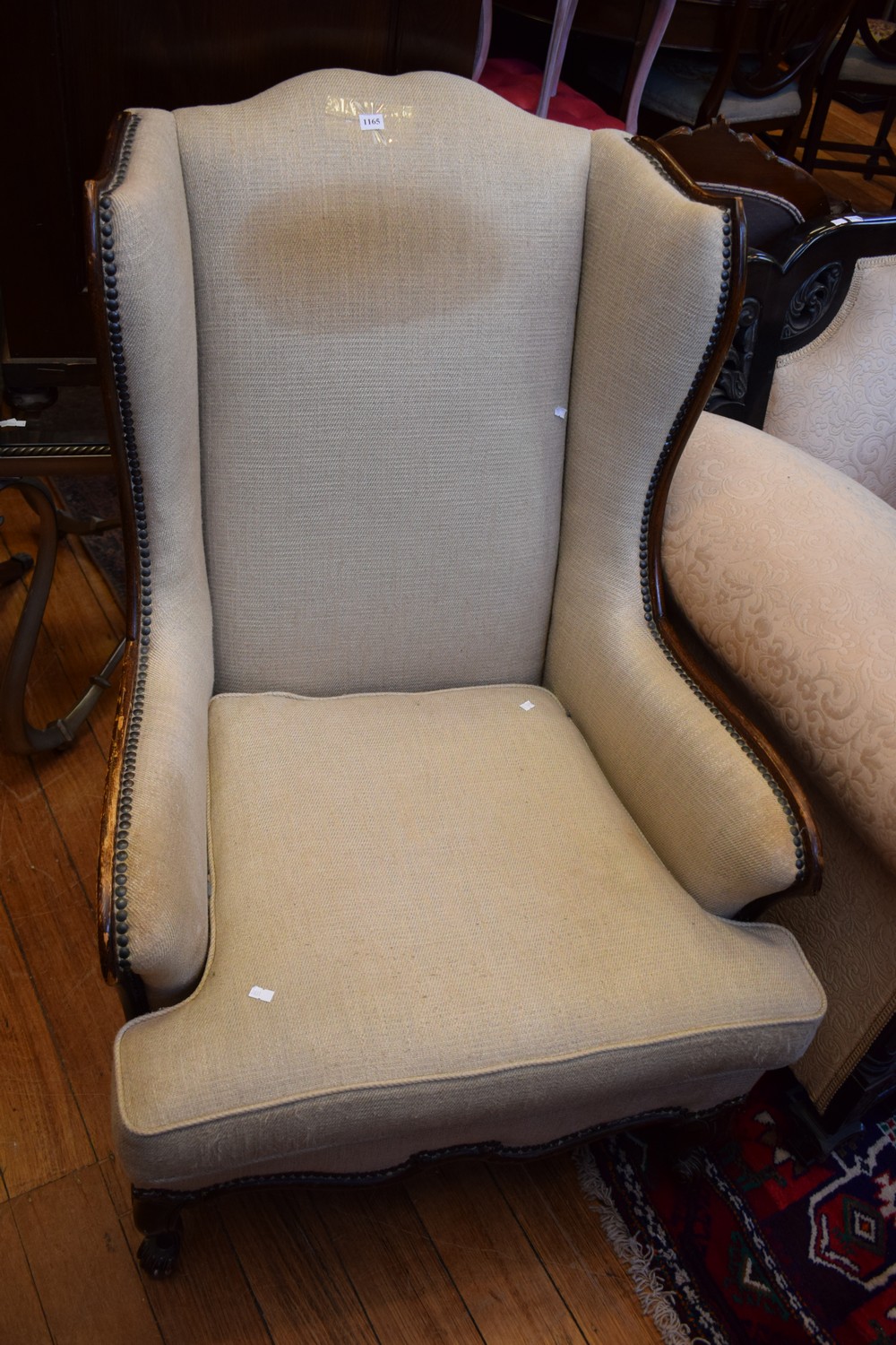 A WINGBACK ARMCHAIR IN STIPPLEBACK TIMBER (A/F - STAINED)