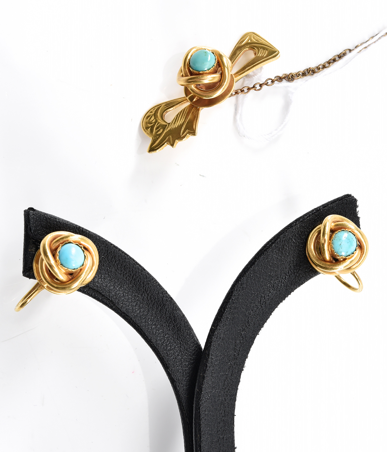 A TURQUOISE JEWELLERY SUITE IN 9CT GOLD, COMPRISING A BROOCH AND A PAIR OF EARRINGS, TOTAL WEIGHT 7.8GMS