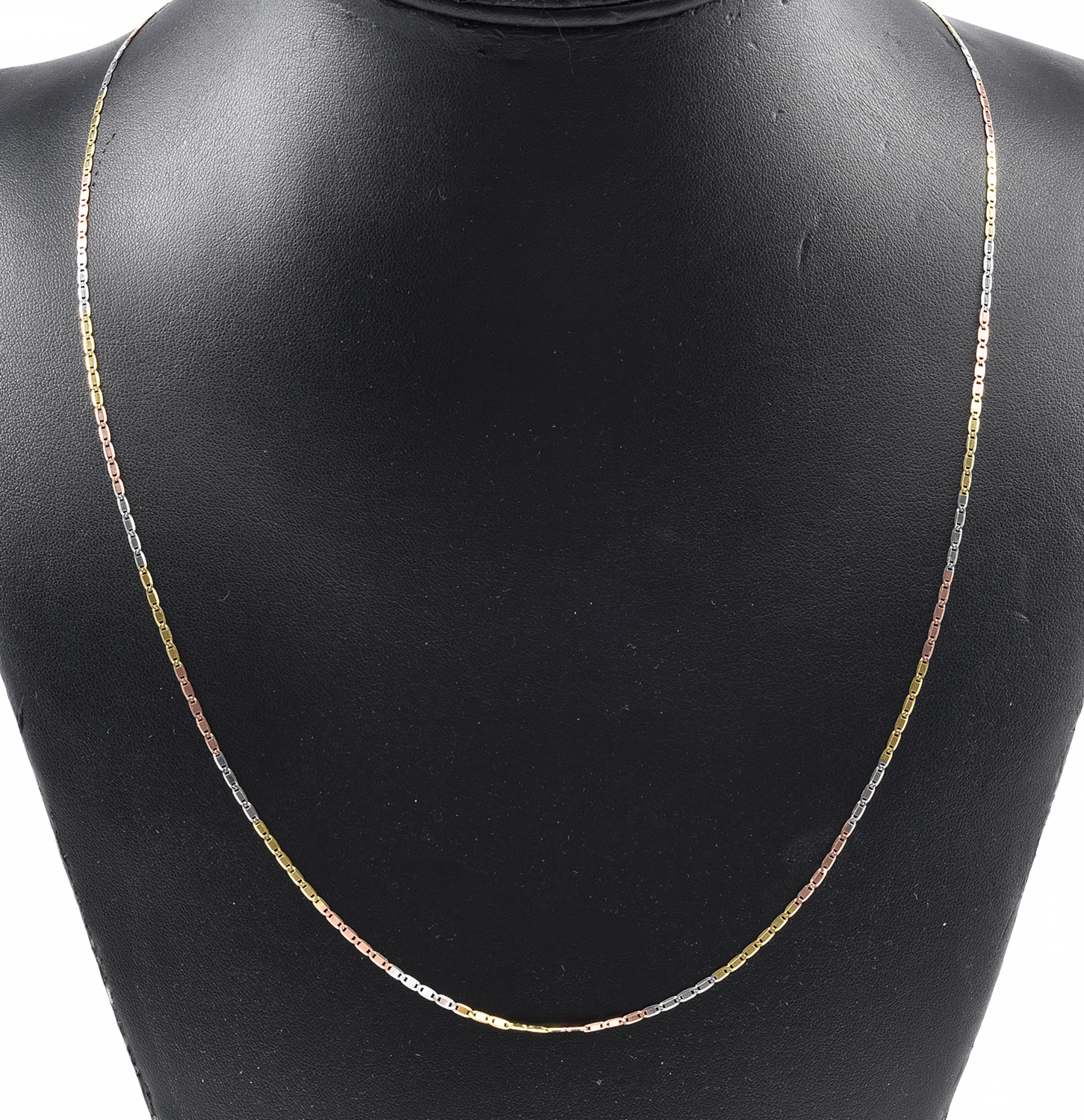 A TRI-COLOUR FANCY FLAT LINK CHAIN IN 18CT GOLD, TOTAL LENGTH 580mm, TOTAL WEIGHT 3.5GMS