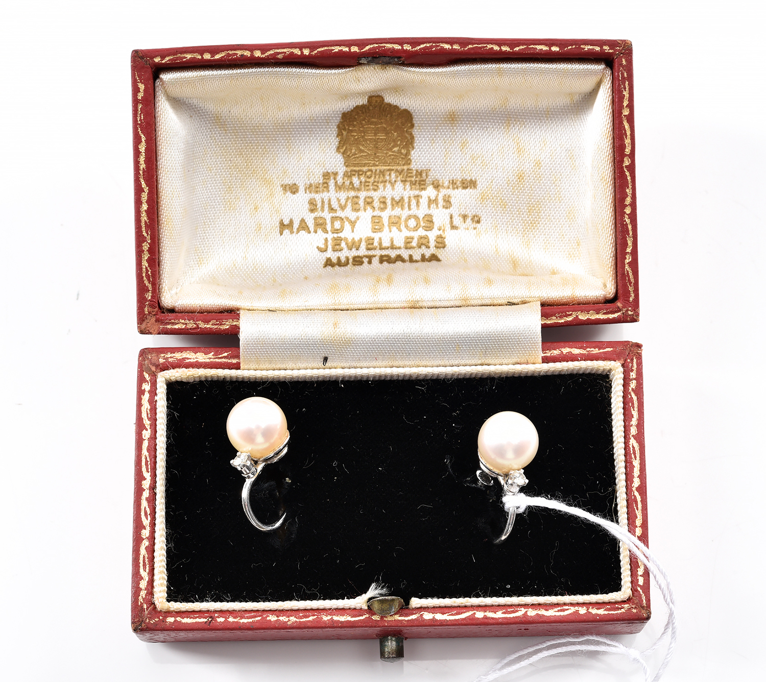 A PAIR OF CULTURED PEARL (7.45MM) AND DIAMOND EARRINGS ACID TESTED IN 9CT WHITE GOLD, BOXED