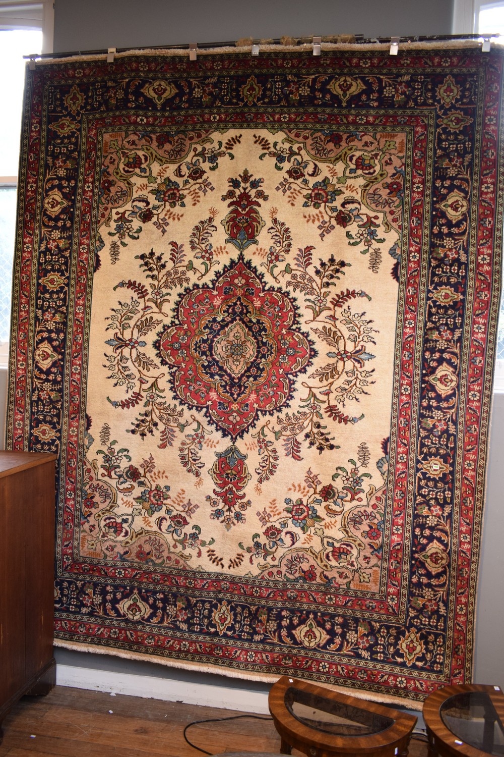 A VINTAGE PERSIAN ROYAL TABRIZ RUG. CIRCA 1970s. 100% WOOL. HAND-KNOTTED CITY WEAVE WITH TRADITIONAL DESIGN OF BOLD MEDALLION AND QUARTERED CORNER MEDALLIONS IN A CREAM FIELD OF FLORAL SPRAYS & LEAVES. BORDER OF PALMETTES AND FLORAL SPRAYS. FULLY RESTORED AND IN GOOD CLEAN CONDITION. SIZE: 296X239CM ORIGIN: PERSIA - RRP: $3,300