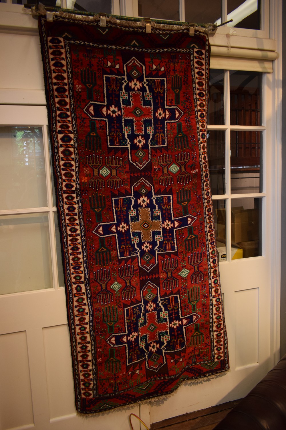 A TRIBAL PERSIAN TORBAT BALOUCH HALL RUNNER, 100% WOOL. IN PRISTINE CONDITION. HAND-KNOTTED TRIBAL WEAVE FROM THE KHORASAN REGION WITH DESIGN OF TRIPLE BOLD ANGULAR MEDALLIONS IN A RED-TONED FIELD OF TRIBAL GUL MOTIFS. SIZE: 235X115CM ORIGIN: PERSIA - RRP: $2,200