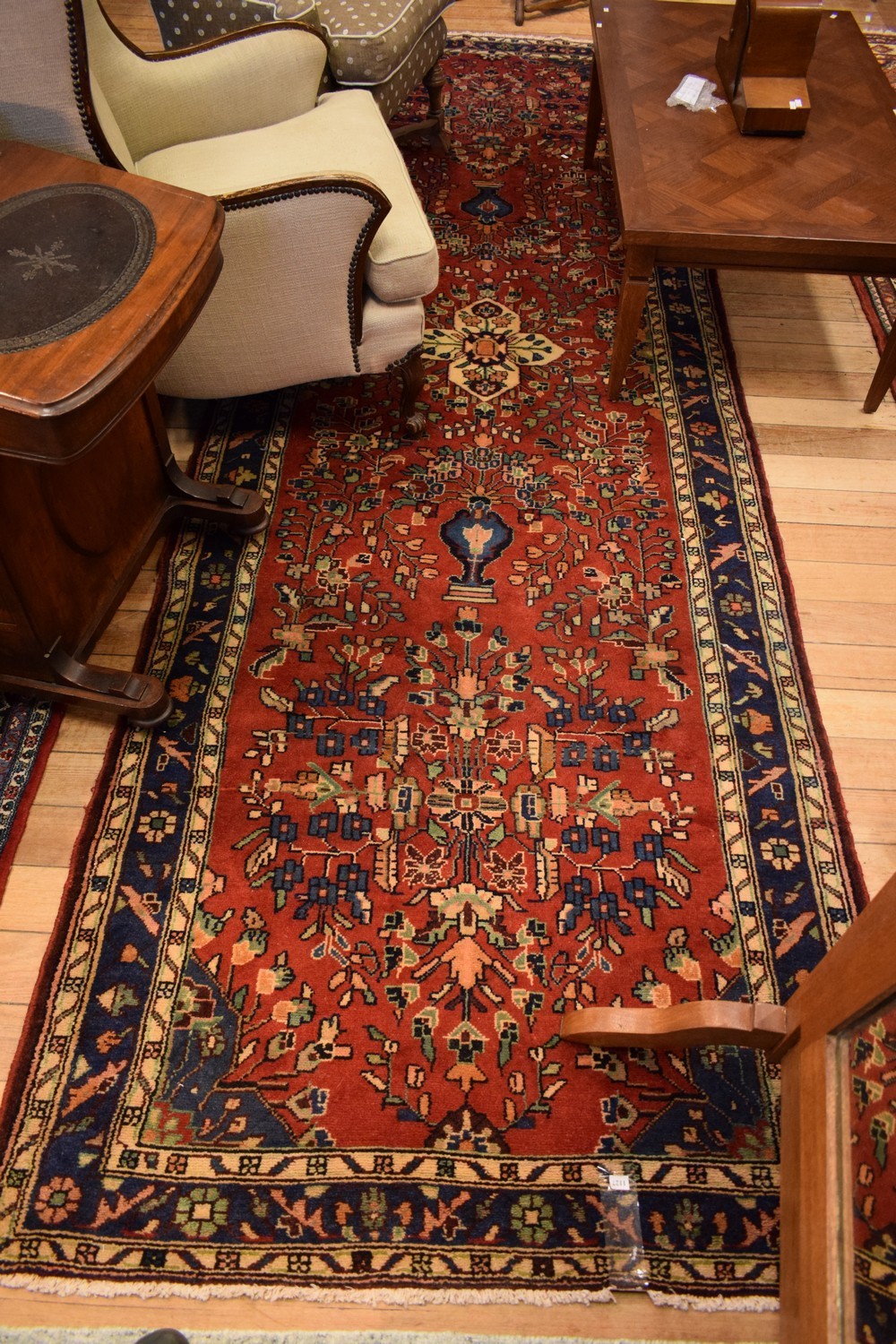 A WIDE PERSIAN MEHRABAN HALL RUNNER. 100% WOOL. DENSE PILE. IN EXCELLENT CONDITION. HAND-KNOTTED & WITH TRADITIONAL DESIGN OF FLORAL MEDALLION IN A RED FIELD OF URNS BEARING FLORAL FOLIAGE AND BOLD FLORAL SPRAYS. BORDER OF FLOWER HEADS. SIZE: 390X125CM ORIGIN: PERSIA - RRP: $3,600