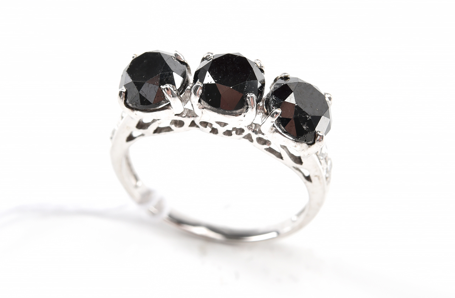 A THREE STONE BLACK DIAMOND RING IN 18CT WHITE GOLD, SIZE N