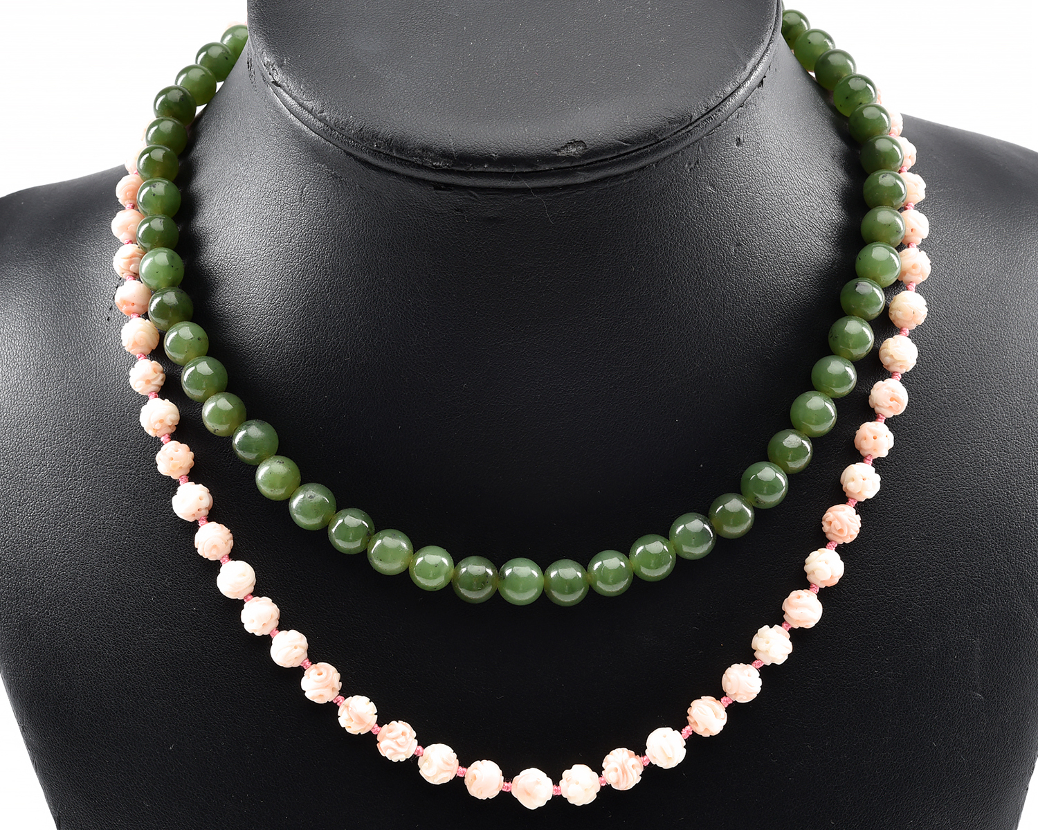 A JADEITE BEAD NECKLACE, WITH A CARVED CORAL BEAD NECKLACE