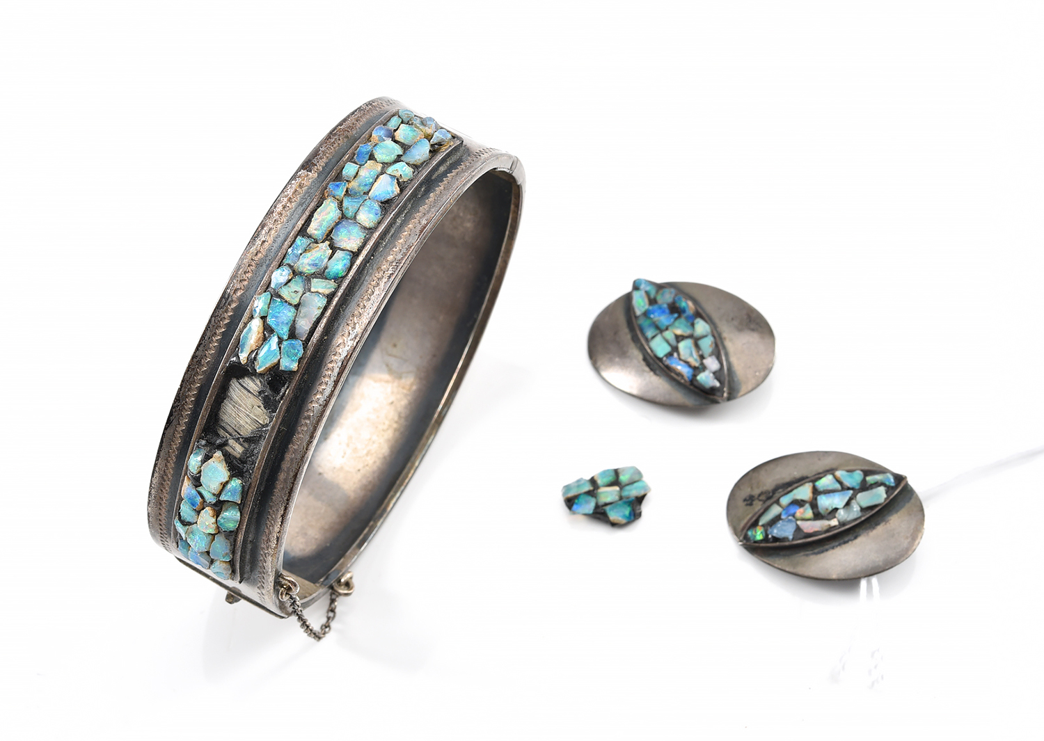A SCANDINAVIAN OPAL AND SILVER SUITE COMPRISING A BANGLE (A/F) AND A PAIR OF CLIP EARRINGS
