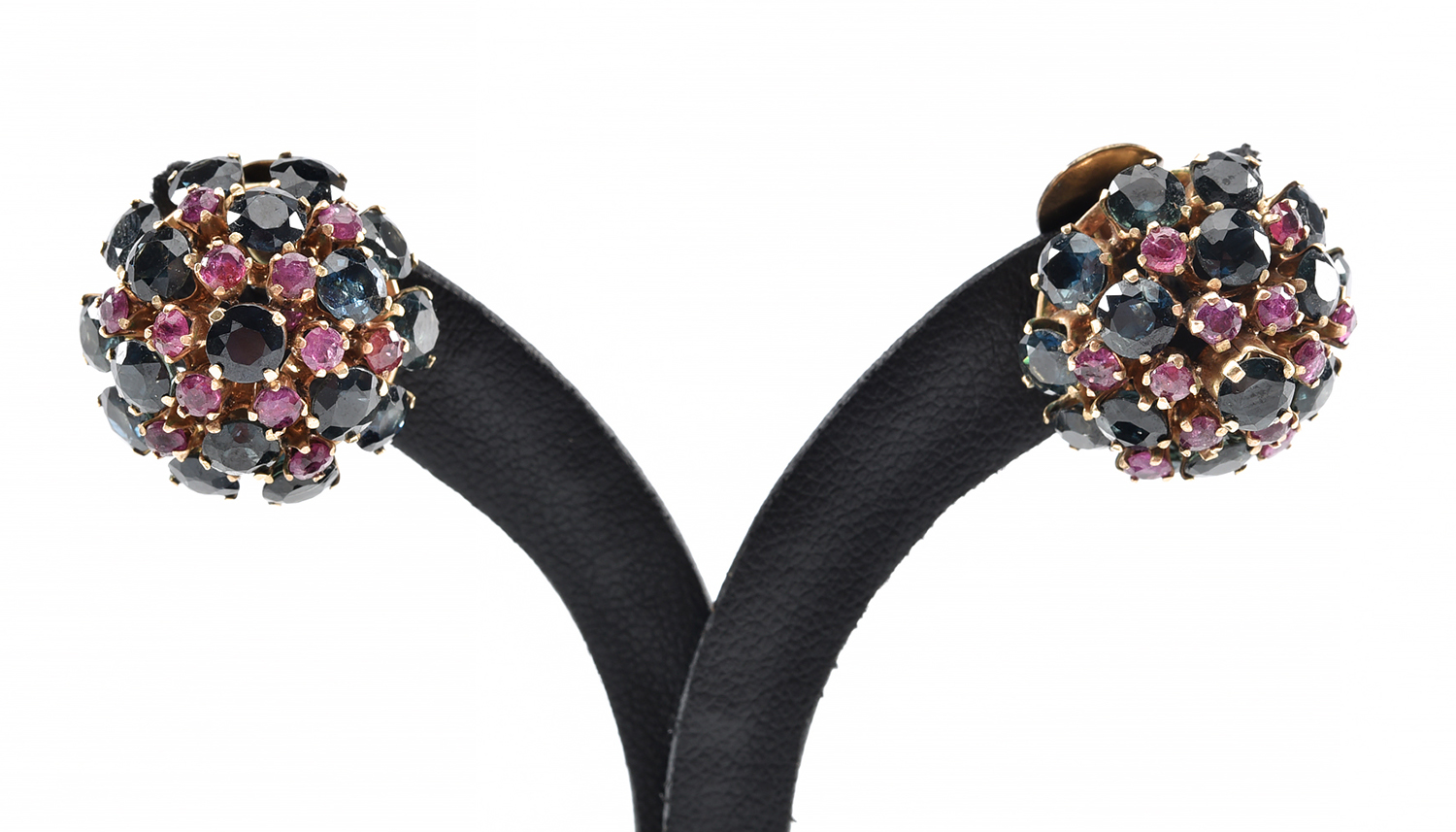 A PAIR OF SAPPHIRE AND RUBY CLIP EARRINGS IN 9CT GOLD, TOTAL WEIGHT 11.2GMS
