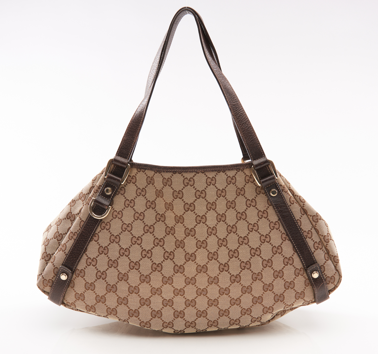 Styled in beige Guccissima monogram canvas with brown leather trim and gold metal hardware, 23 x 42 x 11cm.