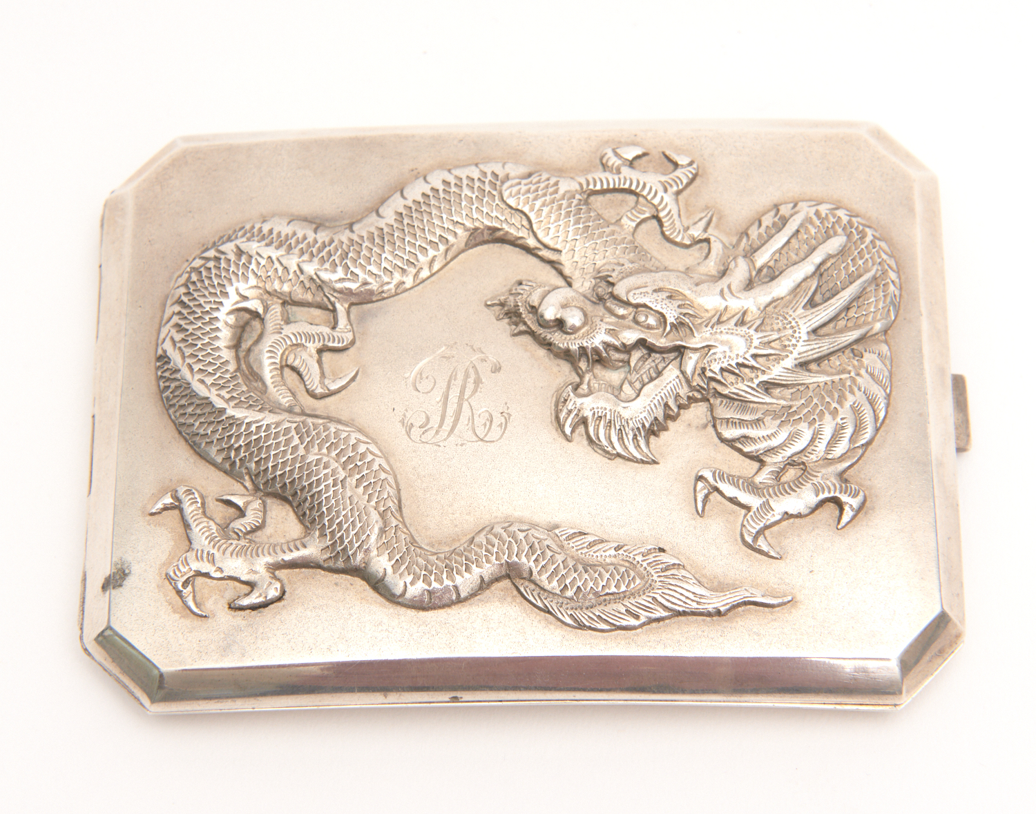 A RUSSIAN EMIGRES SILVER CIGARETTE CASE WITH DRAGON DECORATION, MADE FOR THE CHINESE MARKET, MARKED 84. 10.5CM WIDE, 7.8CM HIGH, 1CM DEEP. APPROXIMATELY 142 GMS SILVER