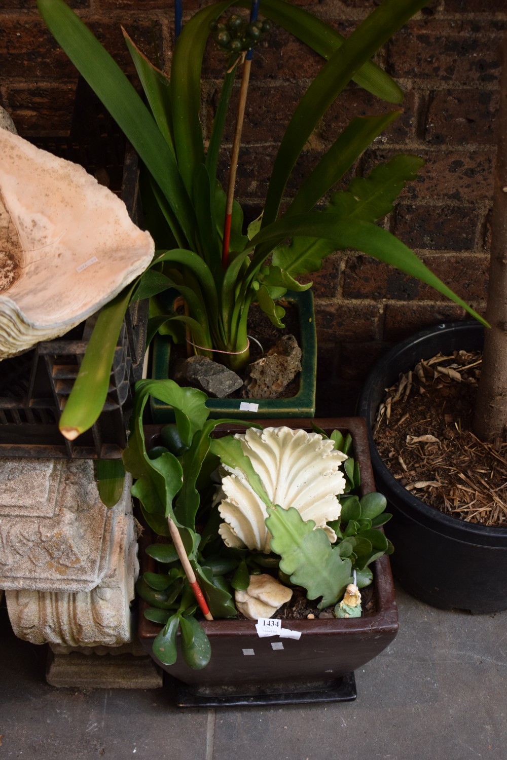 TWO POTTED SUCCULENTS IN GREEN GLAZED AND BROWN POT