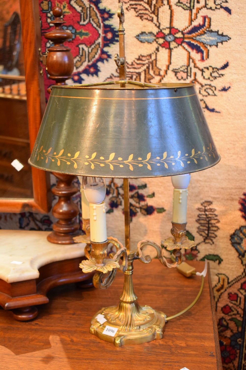A FRENCH GILT DECORATIVE THREE BRANCH TABLE LAMP WITH HAND PAINTED SHADE