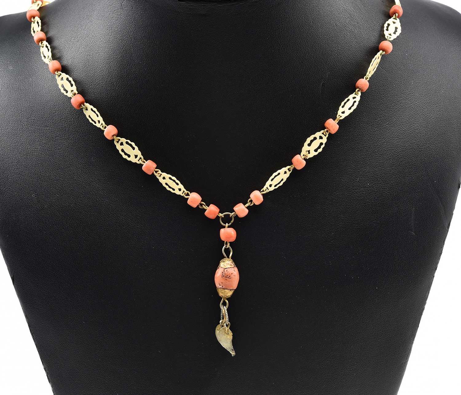 AN ANTIQUE CORAL BEAD NECKLACE WITH BRASS DETAILS