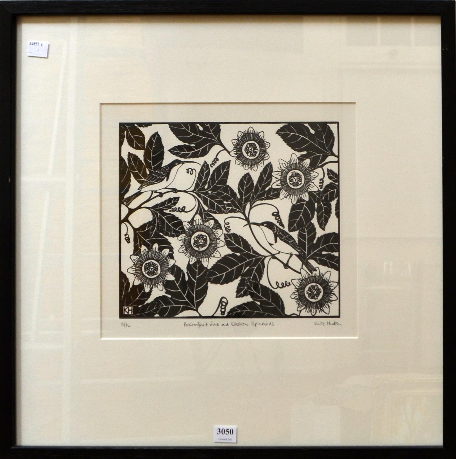 KATE HUDSON, PASSIONFRUIT VINE AND EASTERN SPINEBILLS, LINOCUT, 13/16, IMAGE SIZE: 21 x 24.5CM, CONDITION: VERY GOOD CONDITION, MINOR SCRATCHES TO THE FRAME, FRAME SIZE: 49 x 50.5CM