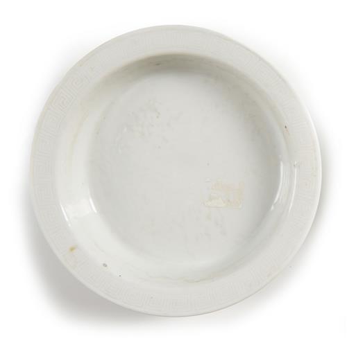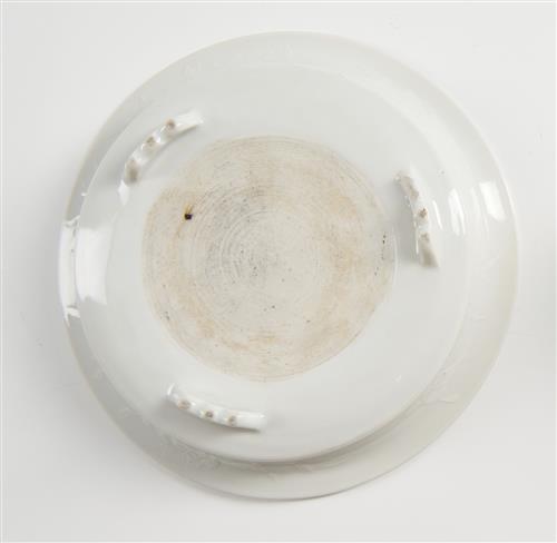 With relief carving of quails, butterflies and peonies, standing on three feet with a key fret border around the rim.