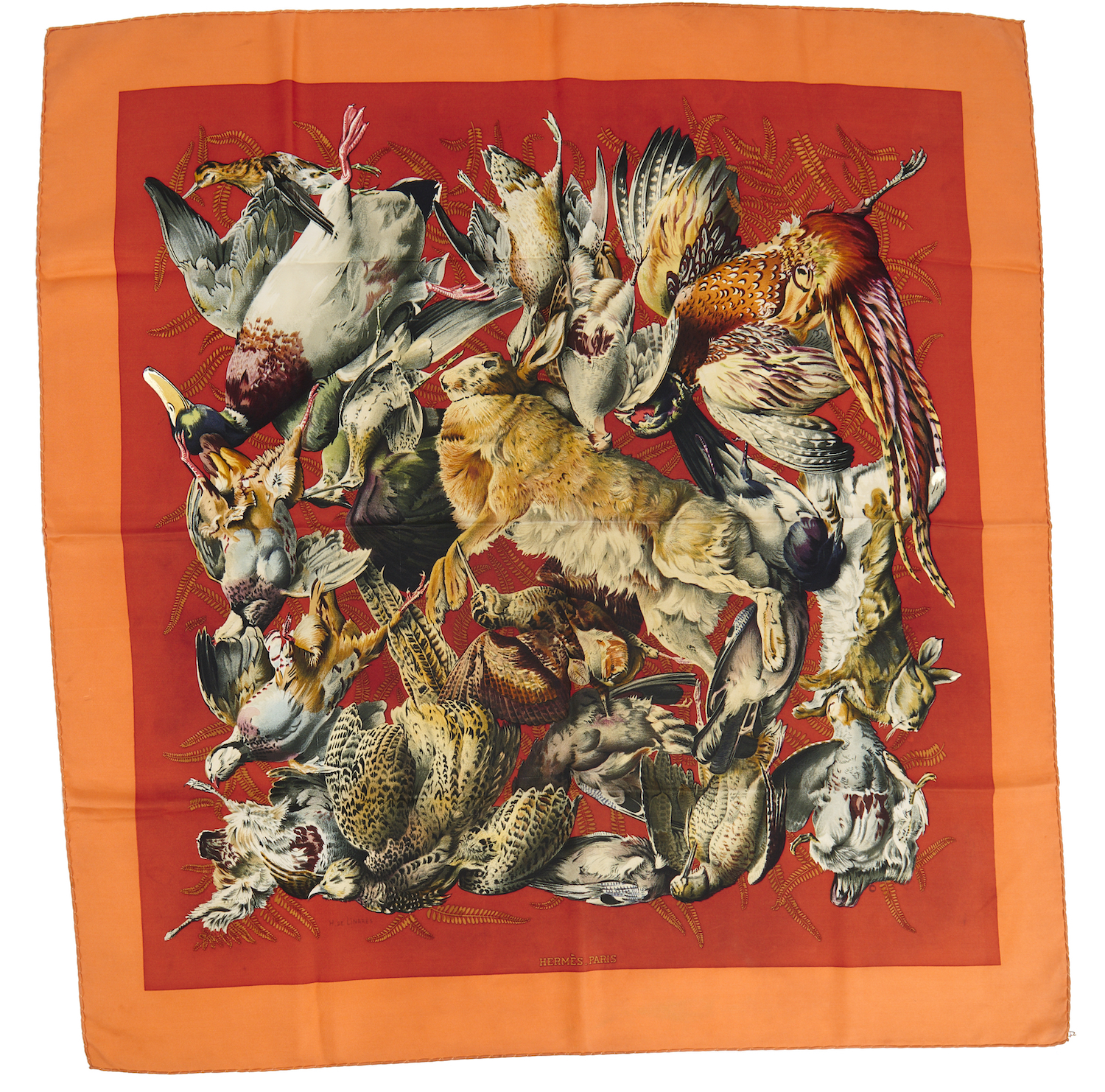 The 'Gibers' design by Henri de Linares, with rabbits and pheasants on a burnt orange background with an orange border, 90cm square.