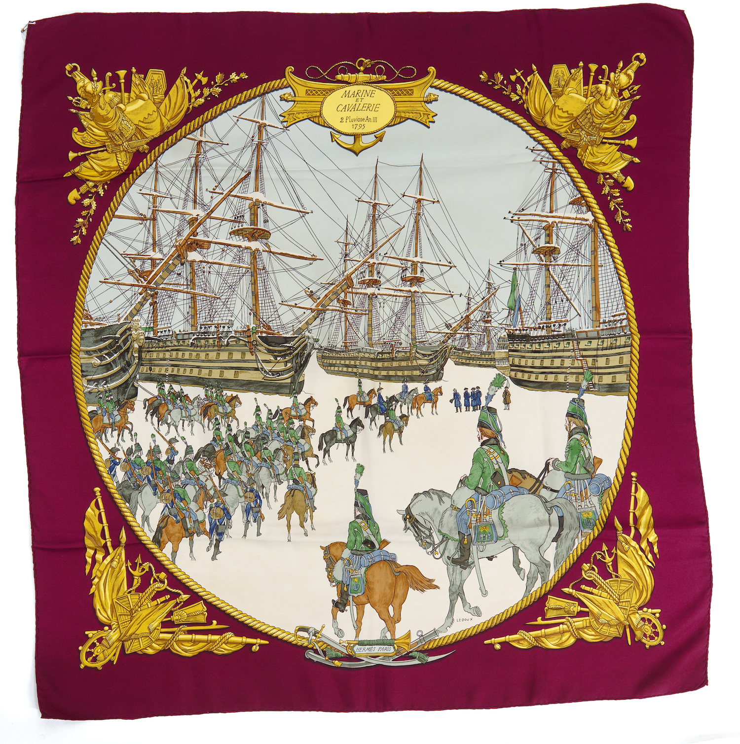 The 'Marine et Cavalerie' design by Philippe Ledoux, with a naval military scene on a grey background with a burgundy boarder, 90cm square.