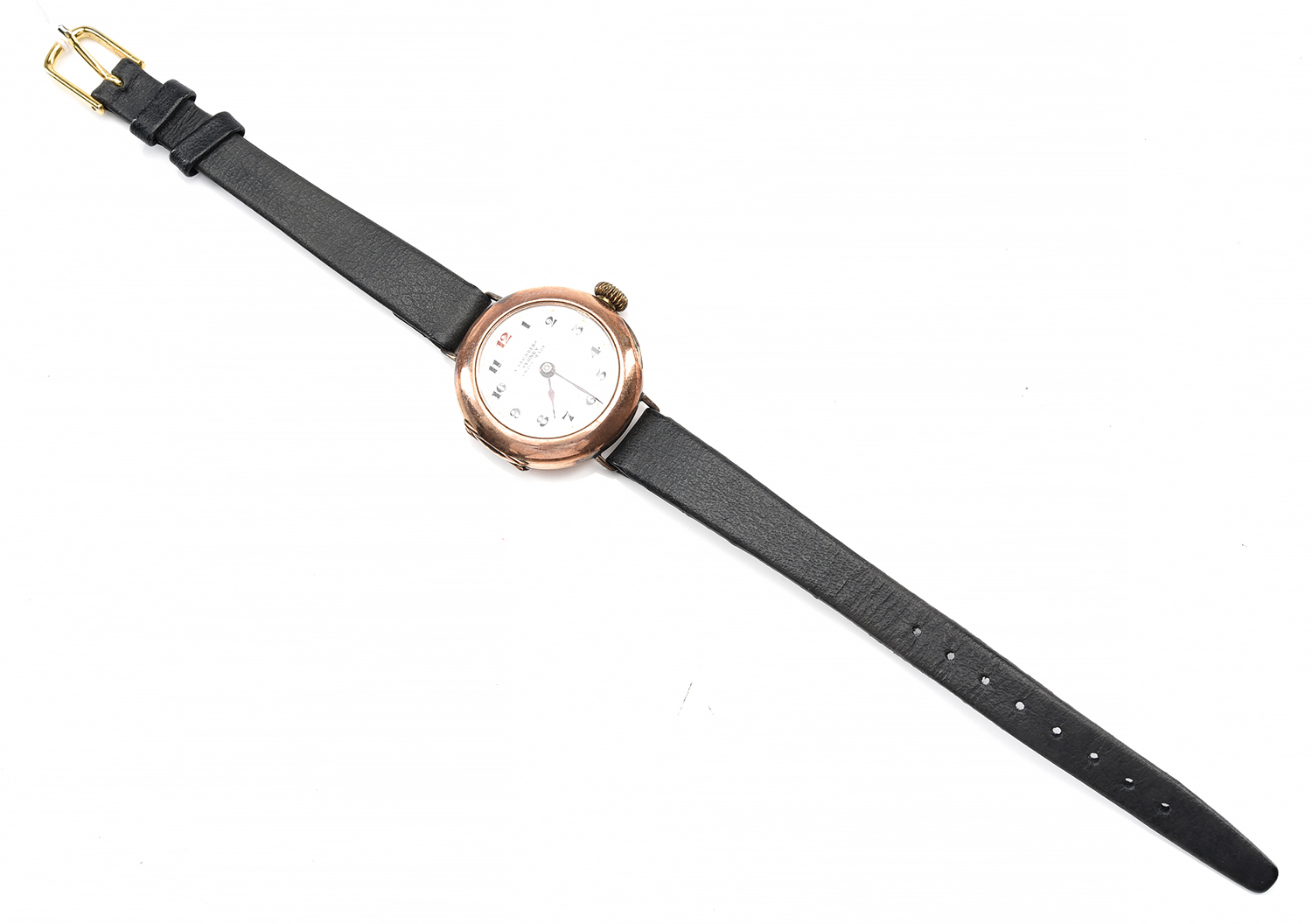 A VINTAGE LADIES WRISTWATCH IN 9CT GOLD, MANUAL WIND, TO BLACK LEATHER BANDS, DIAL SIGNED SAUNDERS & CO., SYDNEY