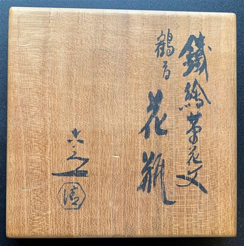Decorated with iron brown and red enamel and gilt decoration of scrolling camellias. Impressed Rokubei mark on the base. Together with tomobako (original signed wooden box) and original sealed cotton wrapping cloth.