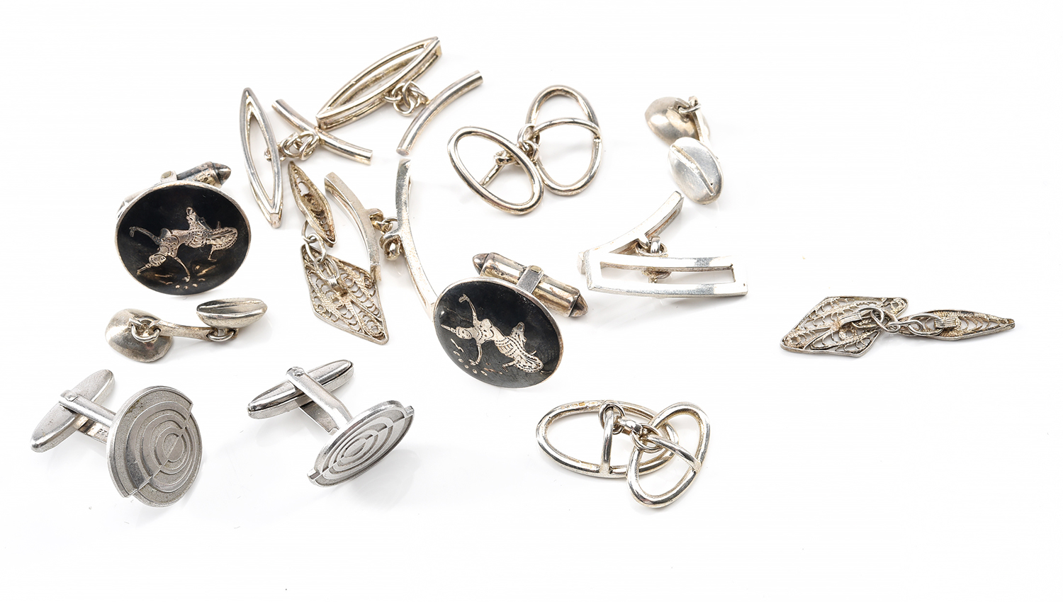 A COLLECTION OF SEVEN VINTAGE PAIRS OF SILVER CUFFLINKS, INCLUDING SIAM SILVER
