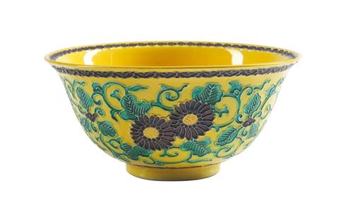 Decorated with slip and overglaze enamels in 'Kochi" style depicting scrolling chrysanthemums. Mark to base reading "Dai Nihon Eiraku Zo". Together with tomobako (original signed wooden box).