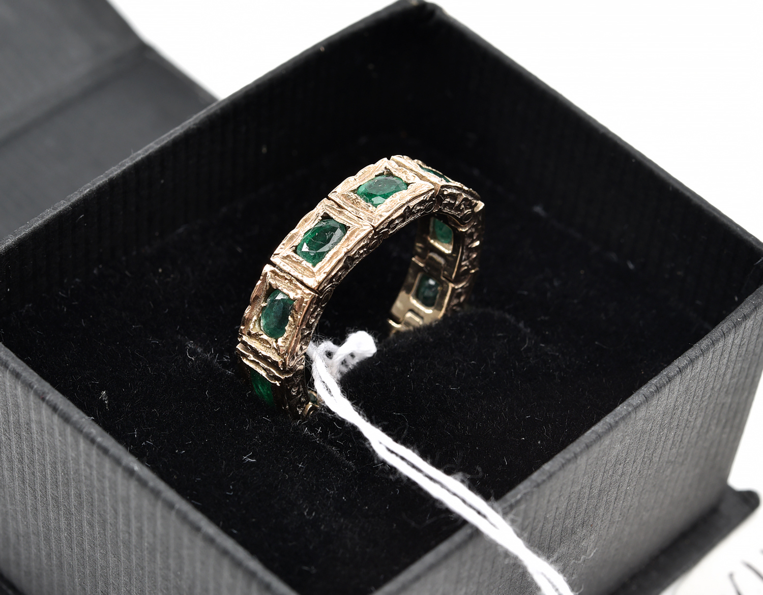 AN EMERALD ETERNITY RING IN 8CT GOLD, SIZE M