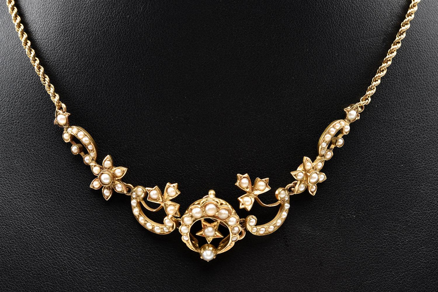 AN AUSTRALIAN ANTIQUE SEED PEARL NECKLACE IN 15CT GOLD, HALLMARKED, (A/F)