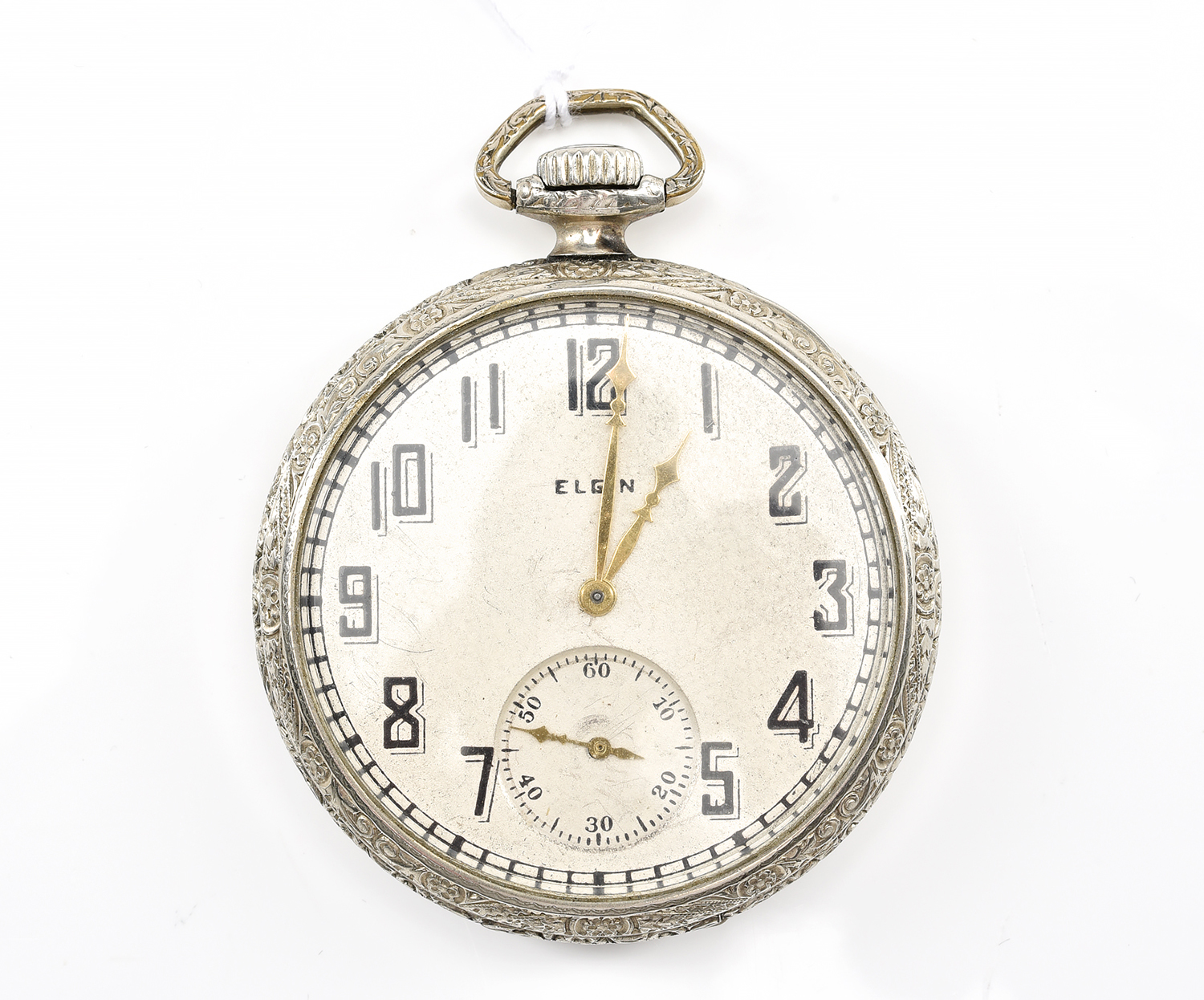 AN ELGIN OPEN FACED POCKET WATCH TO AN ENGRAVED SILVER CASE