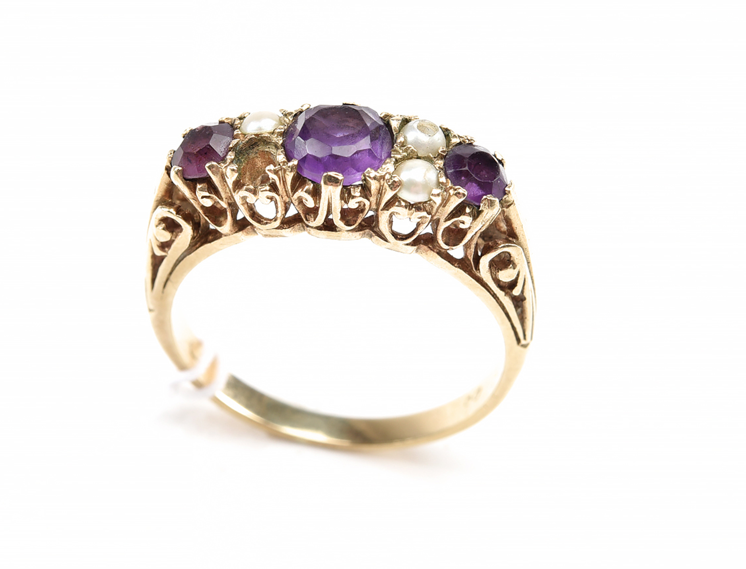 A SEED PEARL AND AMETHYST RING IN 18CT GOLD, SIZE O, (A/F)