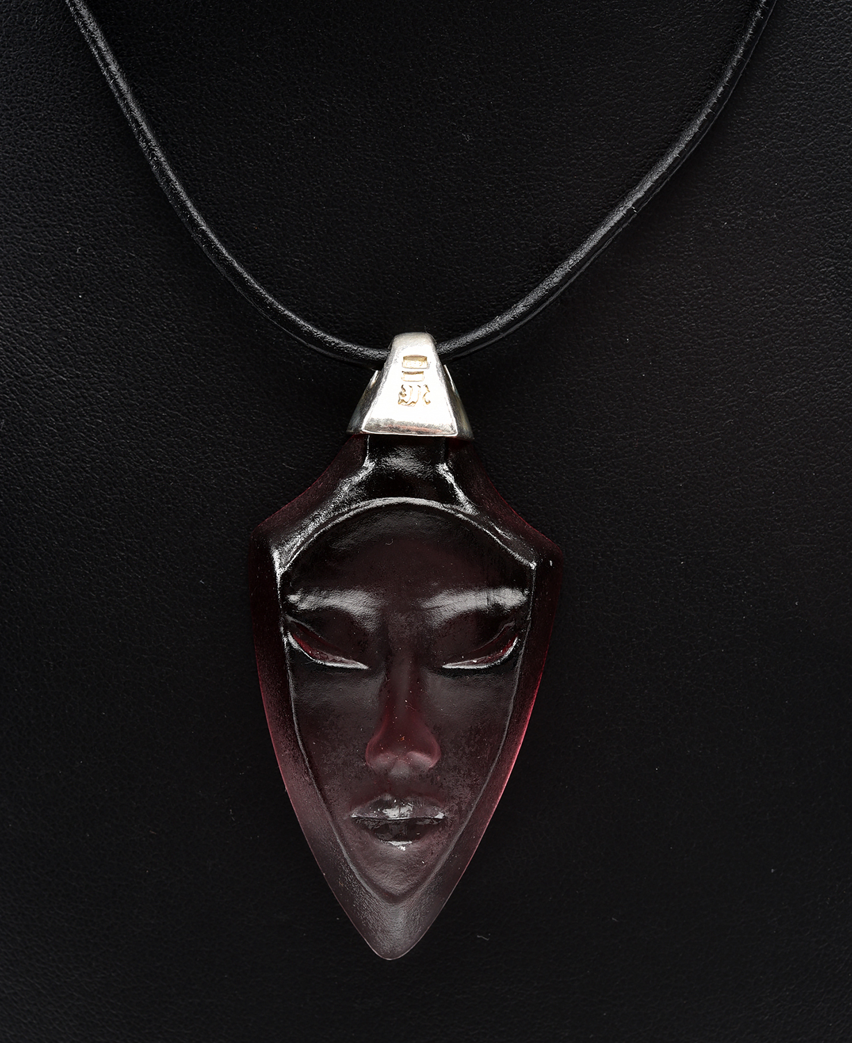 A CARVED MASK PENDANT IN GLASS TO A SILVER AND LEATHER NECKLET