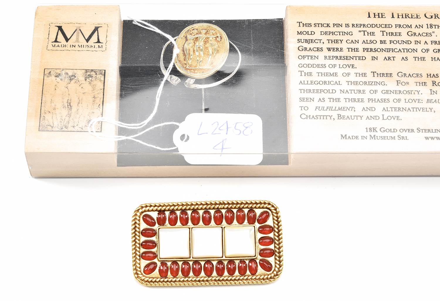 A STICK PIN DEPICTING THE THREE GRACES, TOGETHER WITH A BROOCH