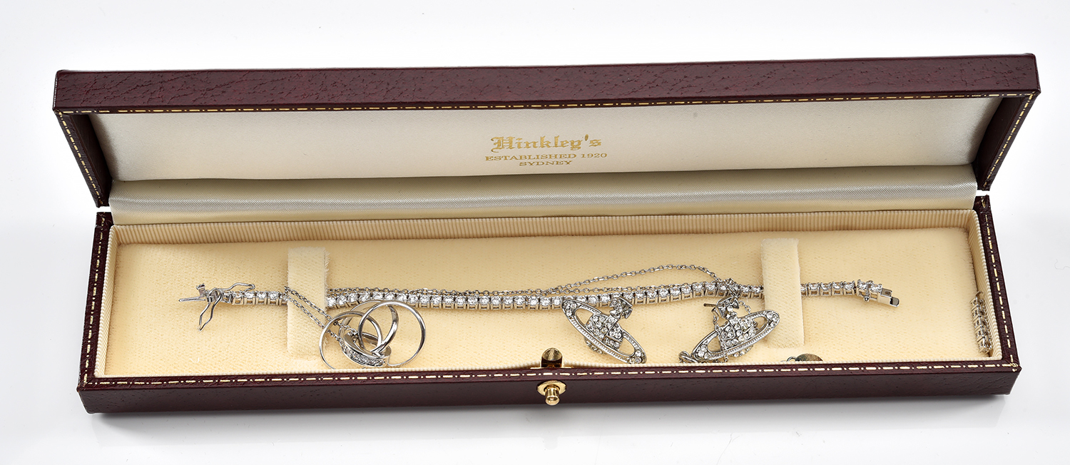 A COLLECTION OF WHITE STONE SET JEWELLERY, INCLUDING A PENDANT NECKLACE, EARRINGS AND A LINE BRACELET, (A/F)