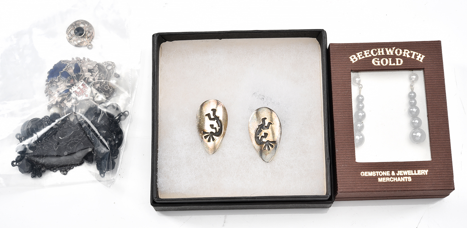 A COLLECTION OF COSTUME JEWELLERY, INCLUDING IRISH DESIGNER EARRINGS, A PENDANT, ENAMEL MEDAL AND EARRINGS, (A/F)