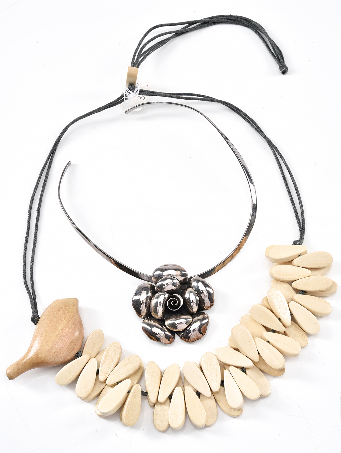 TWO DESIGNER JEWELLERY NECKLACES COMPRISING A FLORAL PENDANT NECKLACE IN STERLING SILVER AND A WOODEN NECKLACE