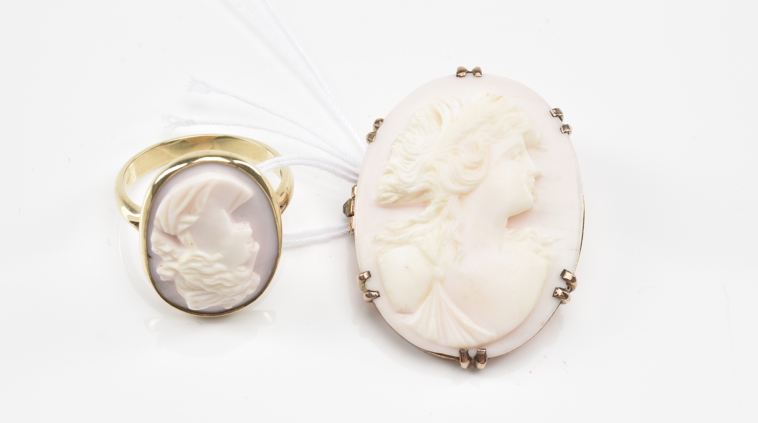 A CAMEO BROOCH, TOGETHER WITH A CAMEO RING, SIZE P, BOTH IN 9CT GOLD