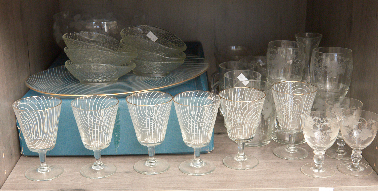 A SHELF OF ASSORTED GLASSWARE INCL. ETCHED STEM WARE, BOXED BOHEMIAN GLASSES ETC