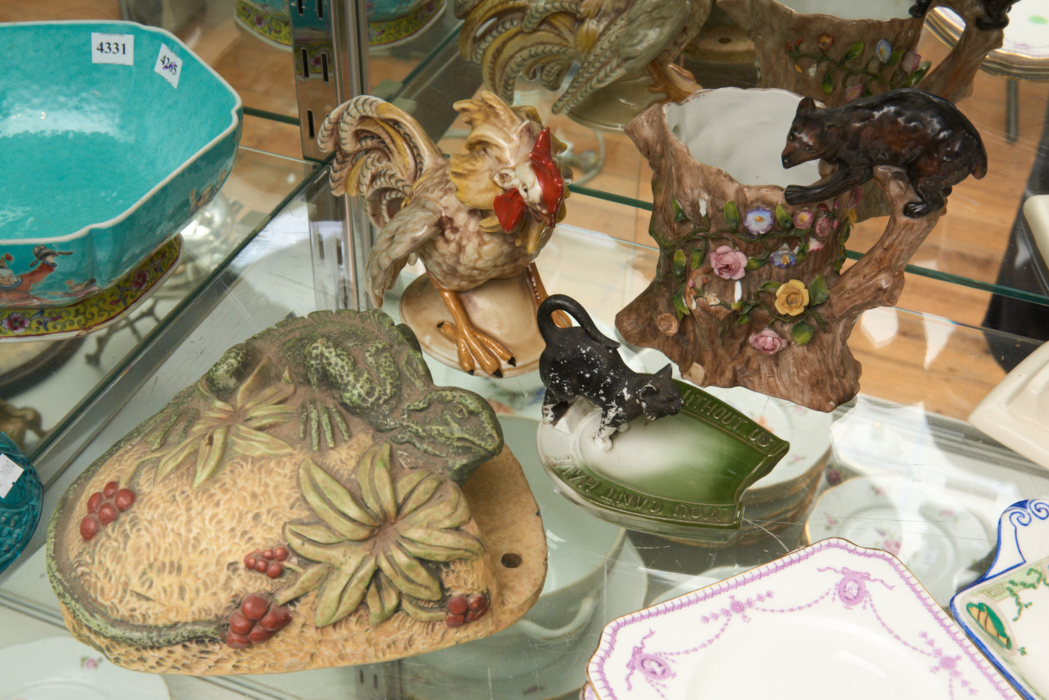 FOUR PORCELAIN ITEMS INCL. CAT ASHTRAY. EUGANA WALL POCKET, BEAR JUG AND ROOSTER FIGURE (SOME FAULTS)