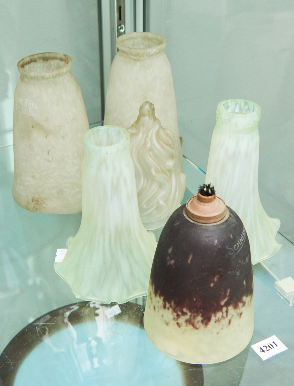 A COLLECTION OF SIX SMALL ART NOUVEAU GLASS SHADES INCLUDING SCHNEIDER AND MULLER (SOME FAULTS)