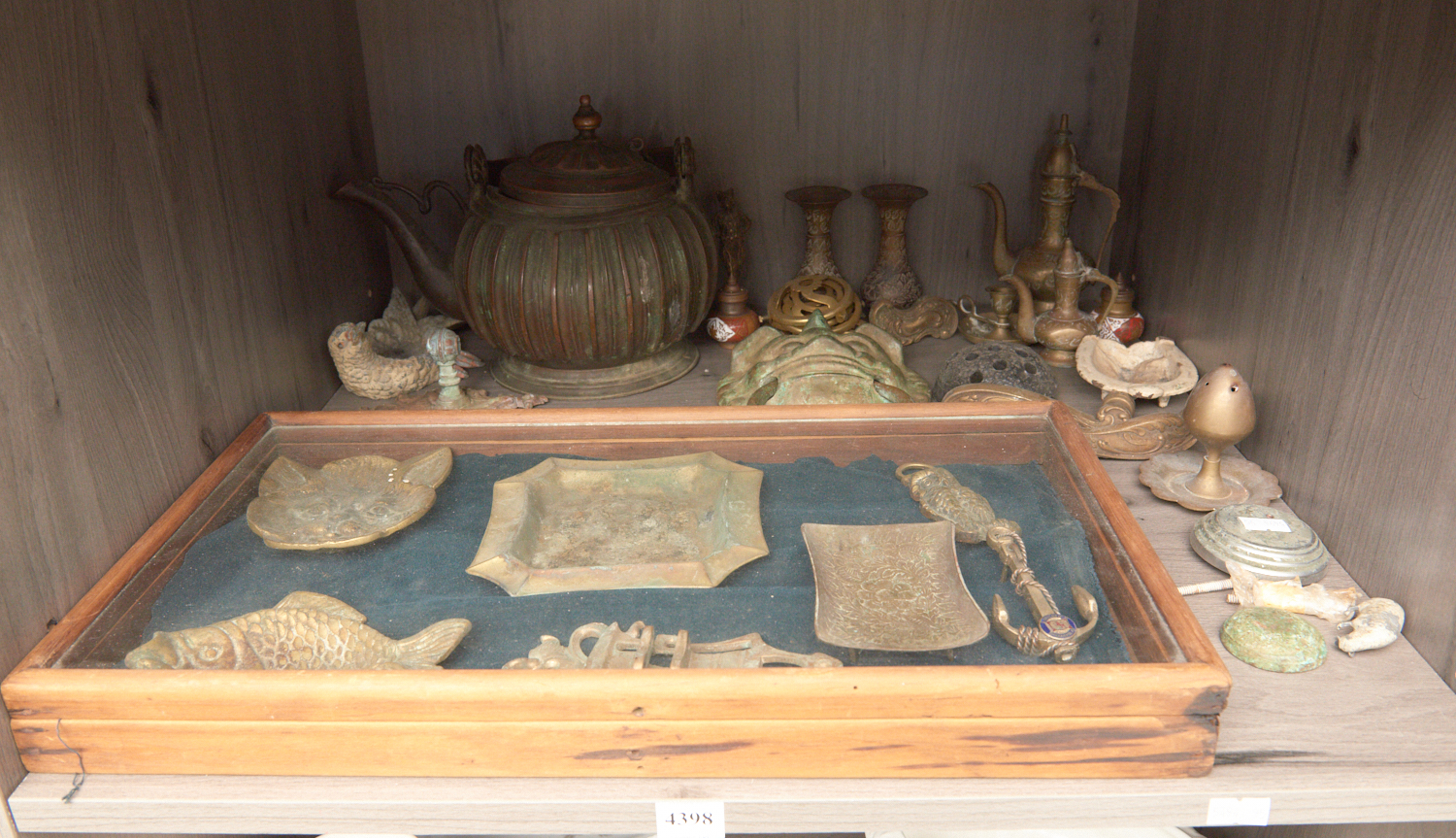 A COLLECTION OF BRASS AND METAL ITEMS INCL. FIGURAL DISHES, DOOR KNOBS, ASHTRAY ALONG WITH A BOX OF GRAMOPHONE NEEDLES