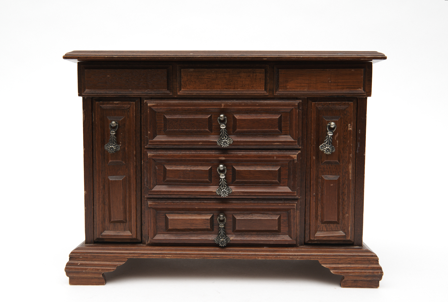 A JEWELLERY BOX IN THE FORM OF A MINIATURE SIDEBOARD CONTAINING COSTUME JEWELLERY
