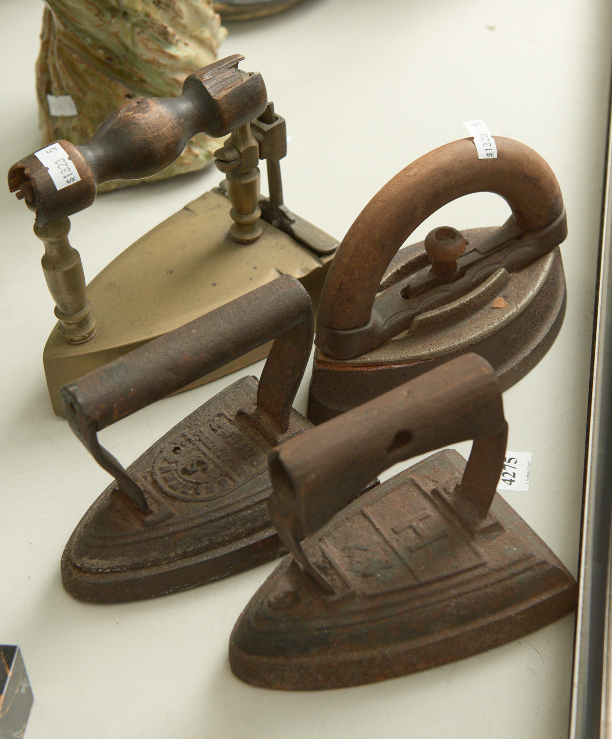 A COLLECTION OF FOUR IRON AND BRASS CLOTHING IRONS