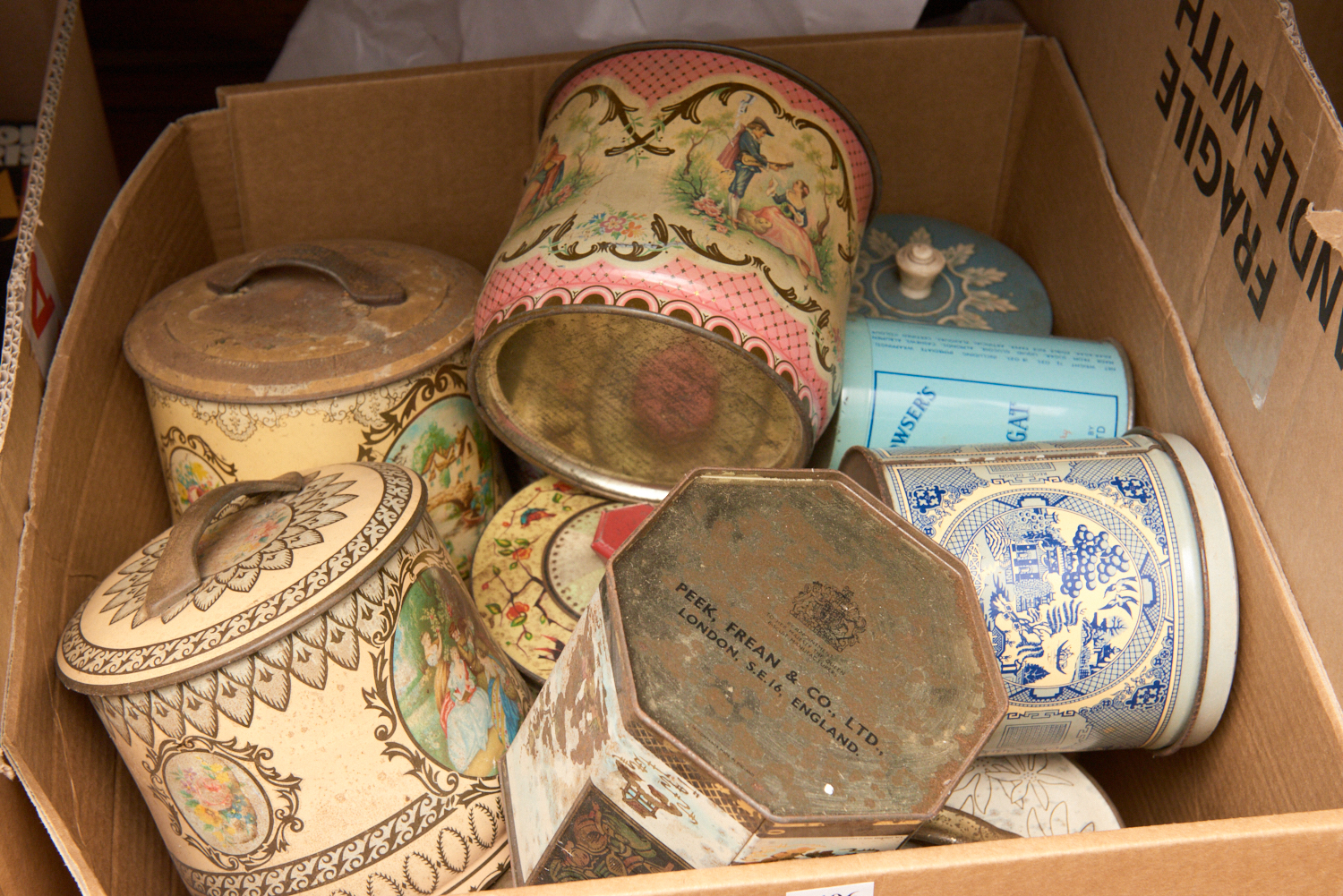 A BOX CONTAINING A COLLECTION OF VINTAGE TINS