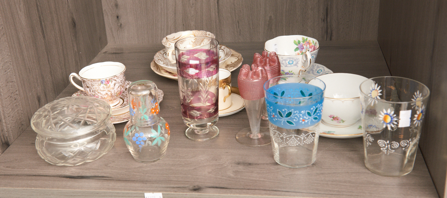 A COLLECTION OF VINTAGE ENAMELLED GLASS TOGETHER WITH MODERN AND ANTIQUE TEAWARE